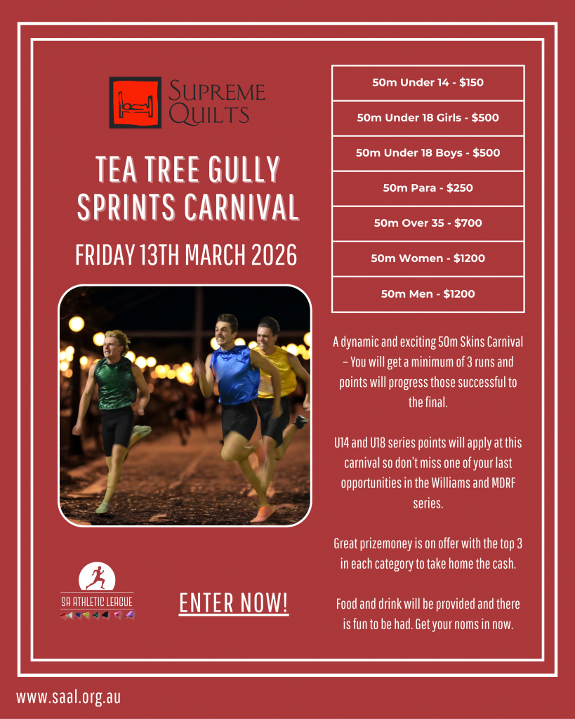 Thanks to Supreme Quilts and Tea Tree Gully Council we bring you a dynamic and exciting 50m Skins Carnival – You will get a minimum of 3 runs and points will progress those successful to the final.