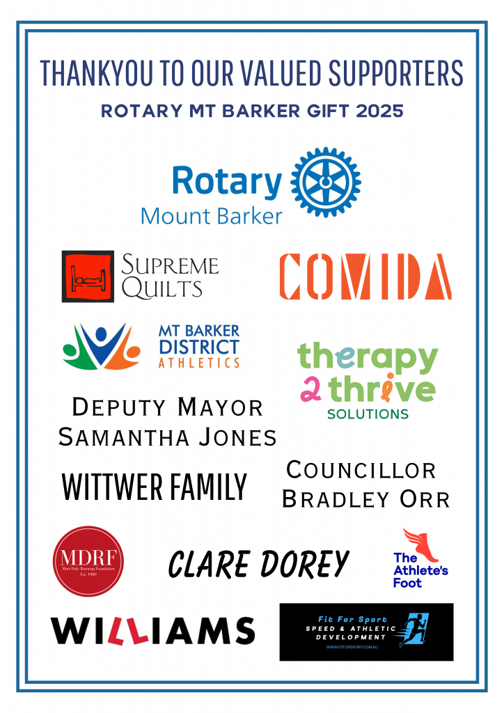 Thank you to Mt Barker District Athletics for hosting the meet, in particular Brianna McAvaney. Thanks to Mount Barker Rotary Club for being major sponsors, amazing helpers and may we say they cook a very fine donut! Thank you also to all race sponsors and sash donors! We can’t wait to go again in 2026.