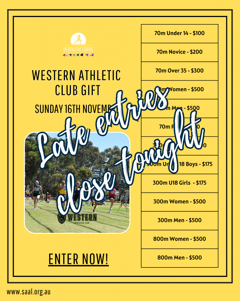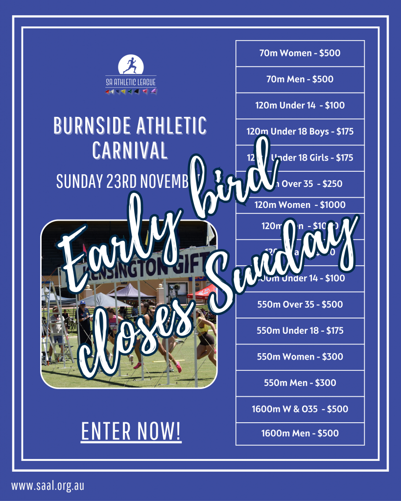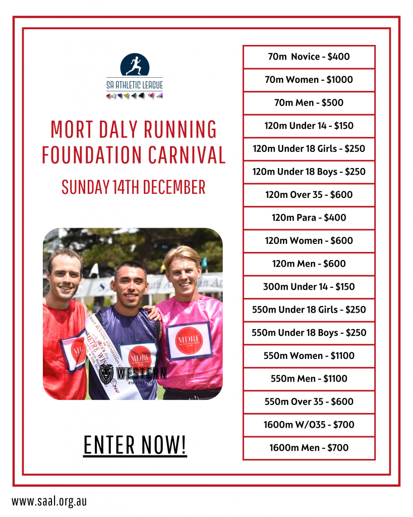 Nominations are now open for the Mort Daly Running Foundation Carnival. This is your opportunity to race on Colley Reserve just before the Bay Sheffield. The meet features the 550m Ian Reddaway Memorial Women’s and Men’s races as well as the 70m Brenda Pearl Sprint.