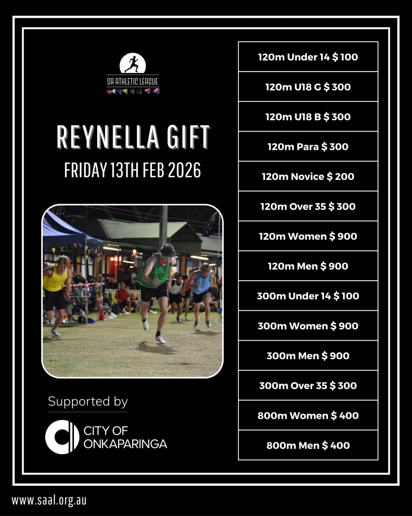 Nominate for upcoming races nowCamden 400m Over 35 Men / Over 30 Women RacesReynella 300m Over 35Loxton 300m Over 35 Men / Over 30 WomenThe final race of the series will be at the Adelaide Hills Picnic Carnival in Mylor, a 300m Over 35 on the 22nd of March so save the date!